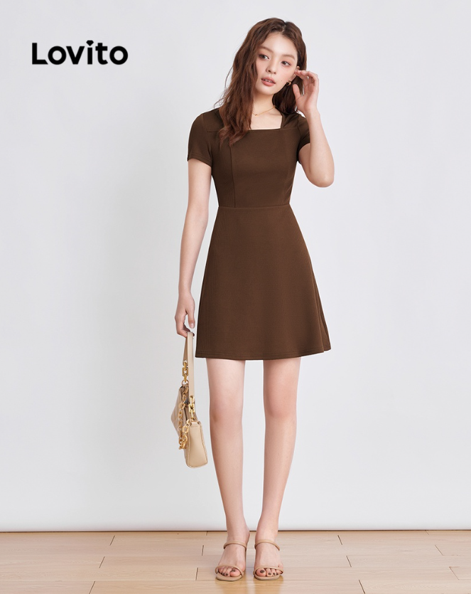 Lovito Casual Plain Draw Back Square Neck Elegant A-Line Women Dress L36ED027 (Brown)