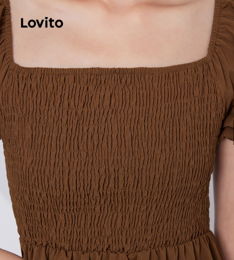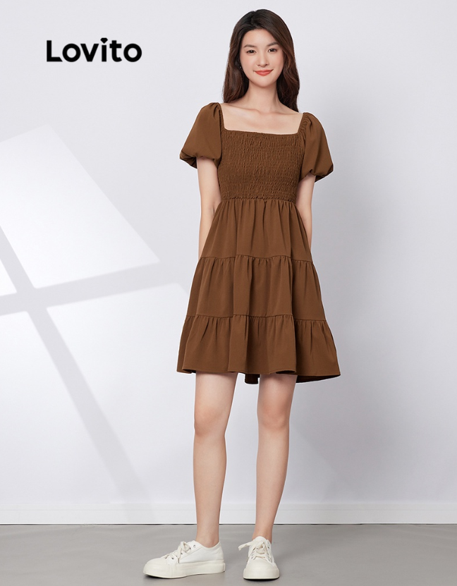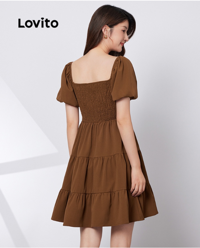 (Multi-colors)Lovito Casual Plain Shirred Puff Sleeve A-Line Dress L29ED022 (Mocha brown)