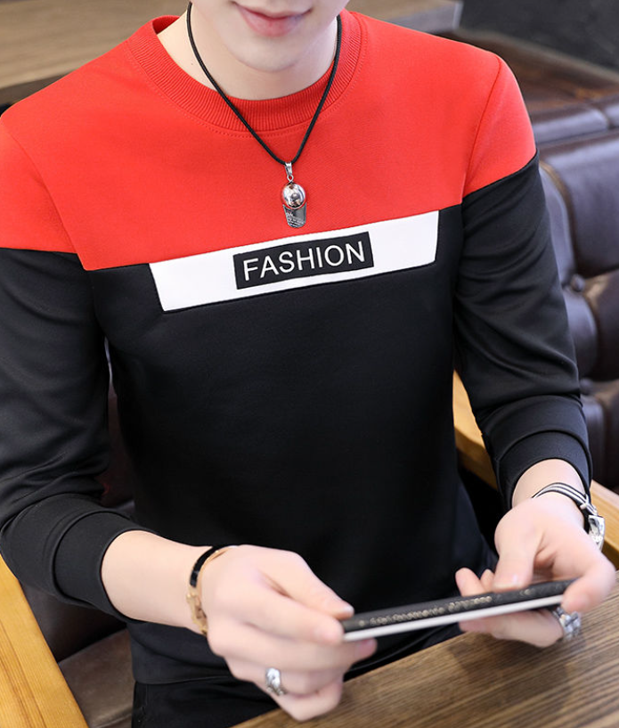 T-shirt men's color matching Sweatshirt slim t-shirt men's Long Sleeve Top Black Red